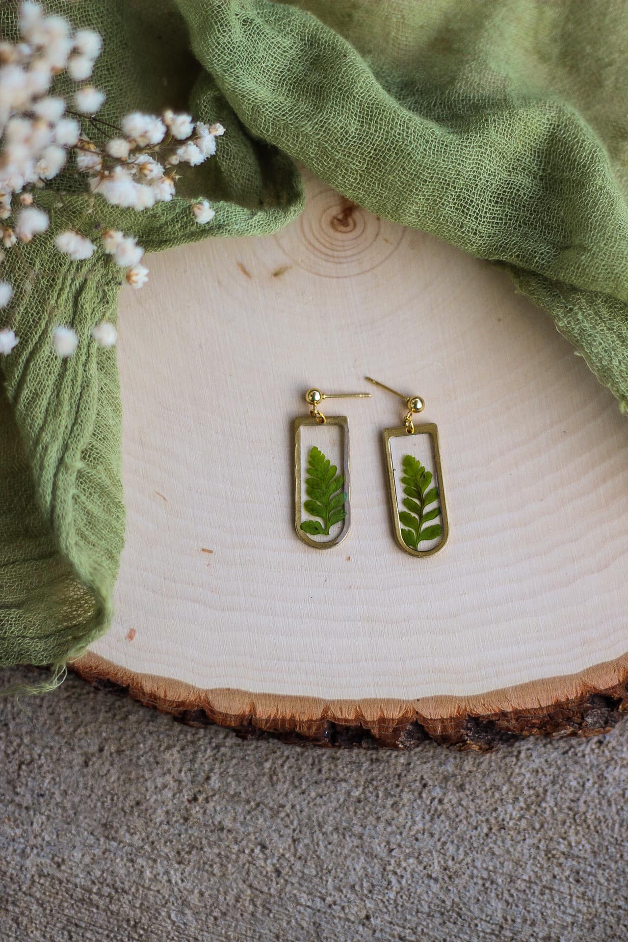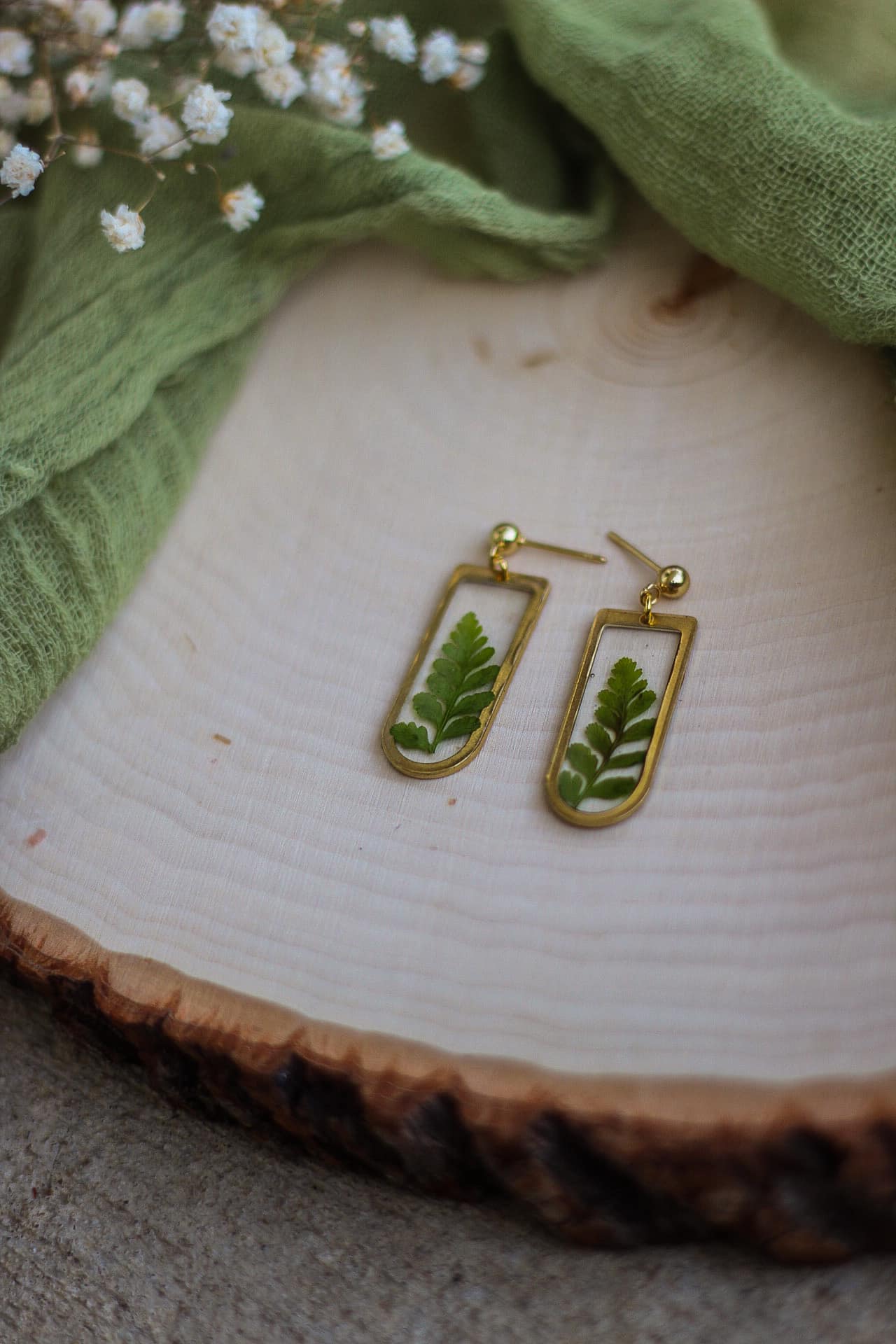 foraged ferns encased in resin with an arched bezel and hypoallergenic ball posts!